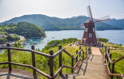 → 시원한 바람 맞으며 구릉에 오르면 학동 몽돌해변과 외도가 한눈에 ! 눈부신 에메랄드빛 바다와 하얀 구름, 네덜란드 풍차가 아름다운 곳이에요!