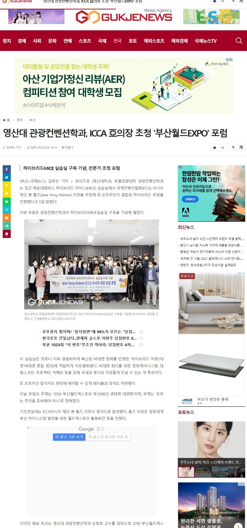 영산대 관광컨벤션학과, ICCA 亞의장 초청 '부산월드EXPO' 포럼 < 부산 < 전국 < 기사본문 - 국제뉴스 (gukjenews.com)
