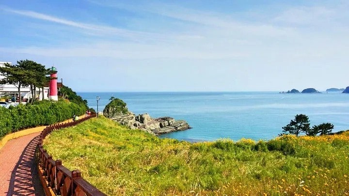 → 시원한 바람 맞으며 구릉에 오르면 학동 몽돌해변과 외도가 한눈에 ! 눈부신 에메랄드빛 바다와 하얀 구름, 네덜란드 풍차가 아름다운 곳이에요!