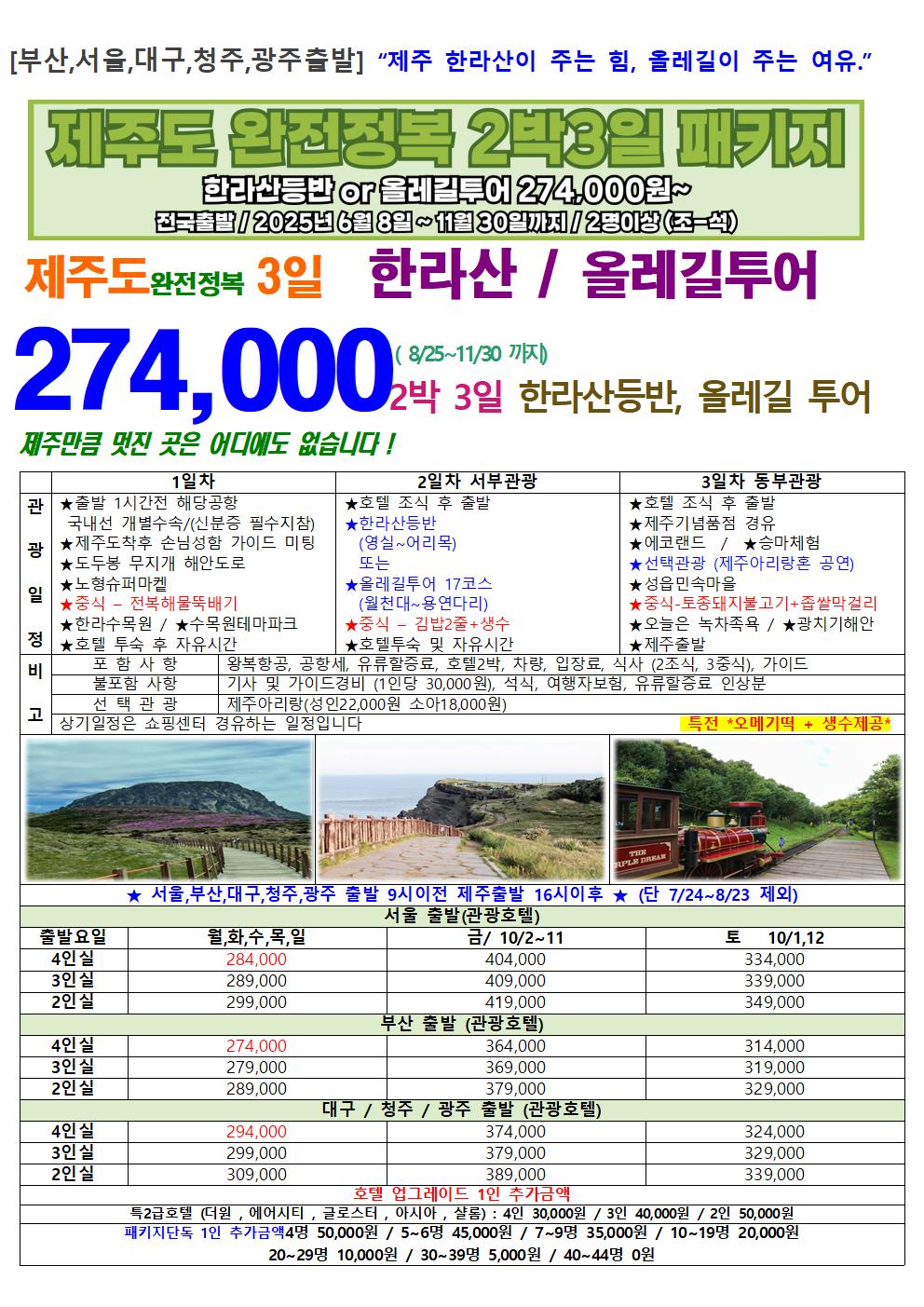- [서울, 울산, 대구, 청주, 광주, 부산 출발] 제주도 3일 “제주 한라산이 주는 힘, 올레길이 주는 여유.”한라산+올레길 멋진 아름다움을 느껴보자!!!